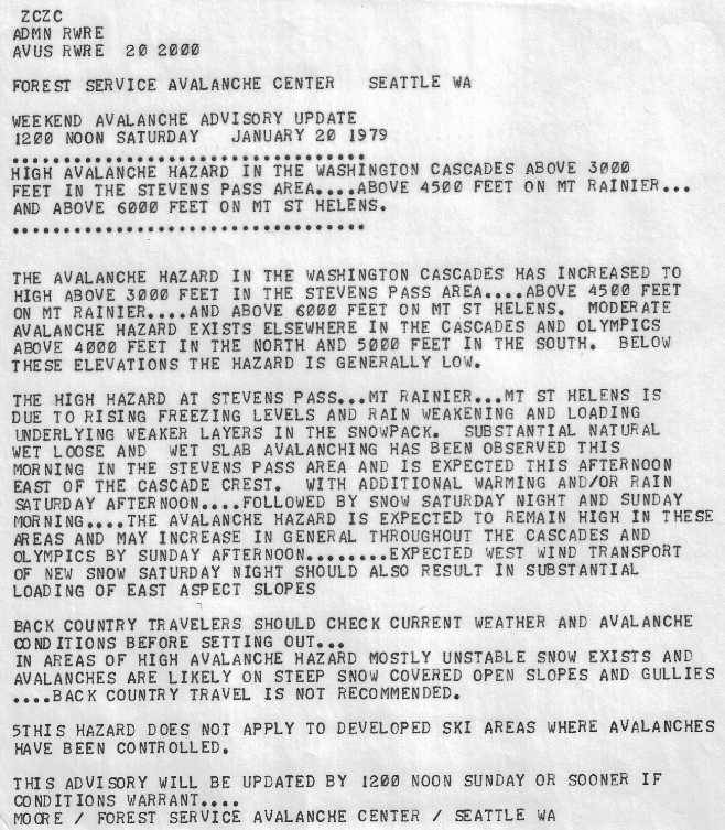 In the mid-1970s, a collaboration was initiated between the Snoqualmie National Forest, Mount Rainier National Park, and the Seattle office of the National Weather Service. At the heart of it were researchers from the University of Washington—most notably snow scientist Ed LaChapelle and graduate students Mark Moore and Rich Marriott.