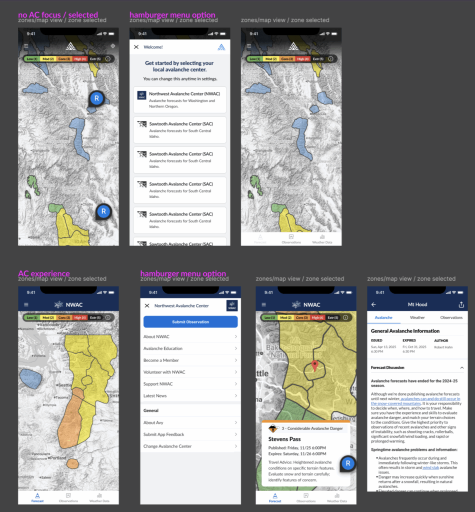 - Forecast User Experience: Eventually, we’ll be redesigning the forecast experience. This will require professional input, user research and design. We are asking questions like: how do users navigate to an avalanche forecast? Do users know which zone they are traveling to? Is there a better way to supplement the forecast with observation or weather data and what is the best way to display that?
