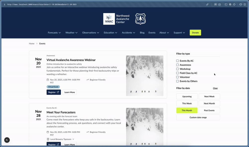 - Location Based Events: When a center, or avalanche course provider, creates an event it will live in a global collection of data that filters into each centers site based on location parameters.